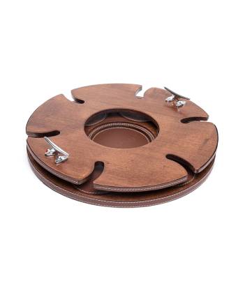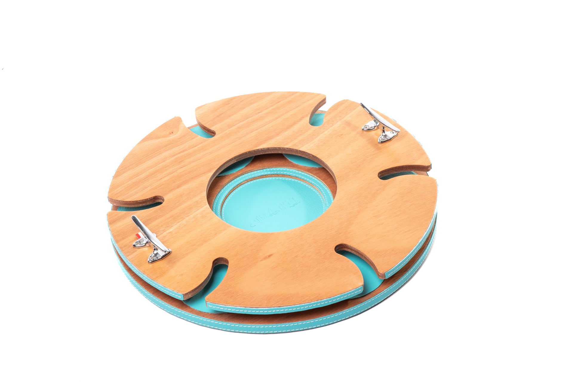 Made of wood, with leather and nautical rope accents. A unique serving option for a wine bucket and 6 glasses.